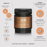 AM: Panax quinquefolius (American Ginseng) extract dry 350 mg, derived from root 3.5 g; Rehmannia glutinosa (Rehmannia) extract dry 40 mg, derived from root 400 mg; Calcium pantothenate 54.59 mg, equiv. Pantothenic acid (Vit. B5) 50 mg; Pyridoxine hydrochloride 25 mg, equiv. Pyridoxine (Vit. B6) 20.57 mg; Calcium folinate 270 micrograms, equiv. Folinic acid 250 micrograms; Mecobalamin (co-methylcobalamin) (active Vit. B12) 100 micrograms; Biotin 2.5 mg; Ascorbic acid (Vit. C) 150 mg; Selenium (as selenomethionine) 75 micrograms; Zinc (as amino acid chelate) 15 mg; Tyrosine 75 mg.