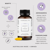 Anxiety + Stress contains Ashwagandha which is traditionally used in Ayurvedic medicines as a rejuvenating tonic. It is an adaptogen to help the body adapt to stress, and relieves feelings of general malaise and debility. Passionflower is traditionally used in western herbal medicine to reduce and relieve the symptoms of mild anxiety, stress and nervous tension, relieve irritability, and calm and soothe the nerves. Vitamin B5 supports cognitive and mental function. Vitamin C is an antioxidant that reduces free radicals formed in the body.